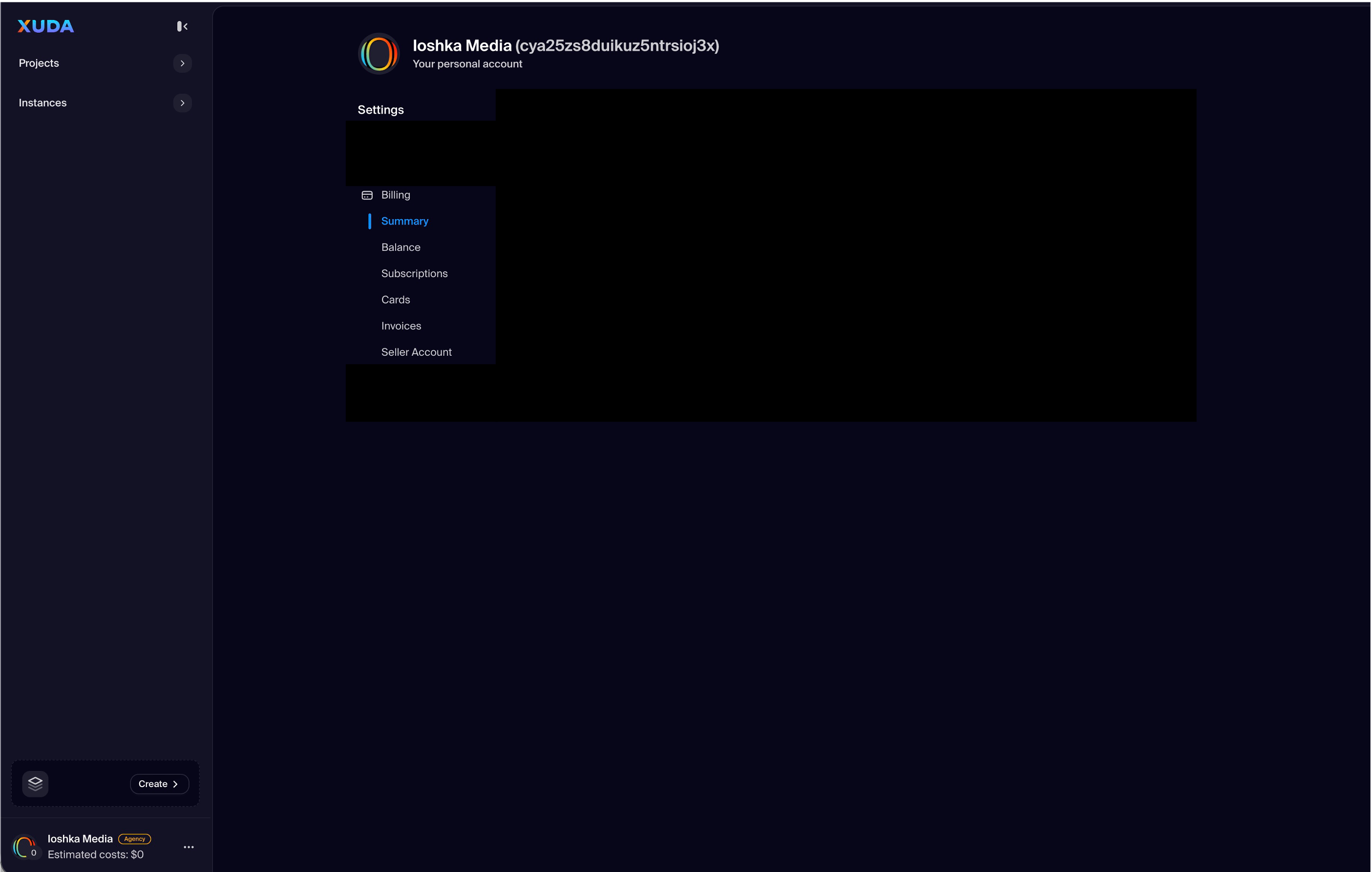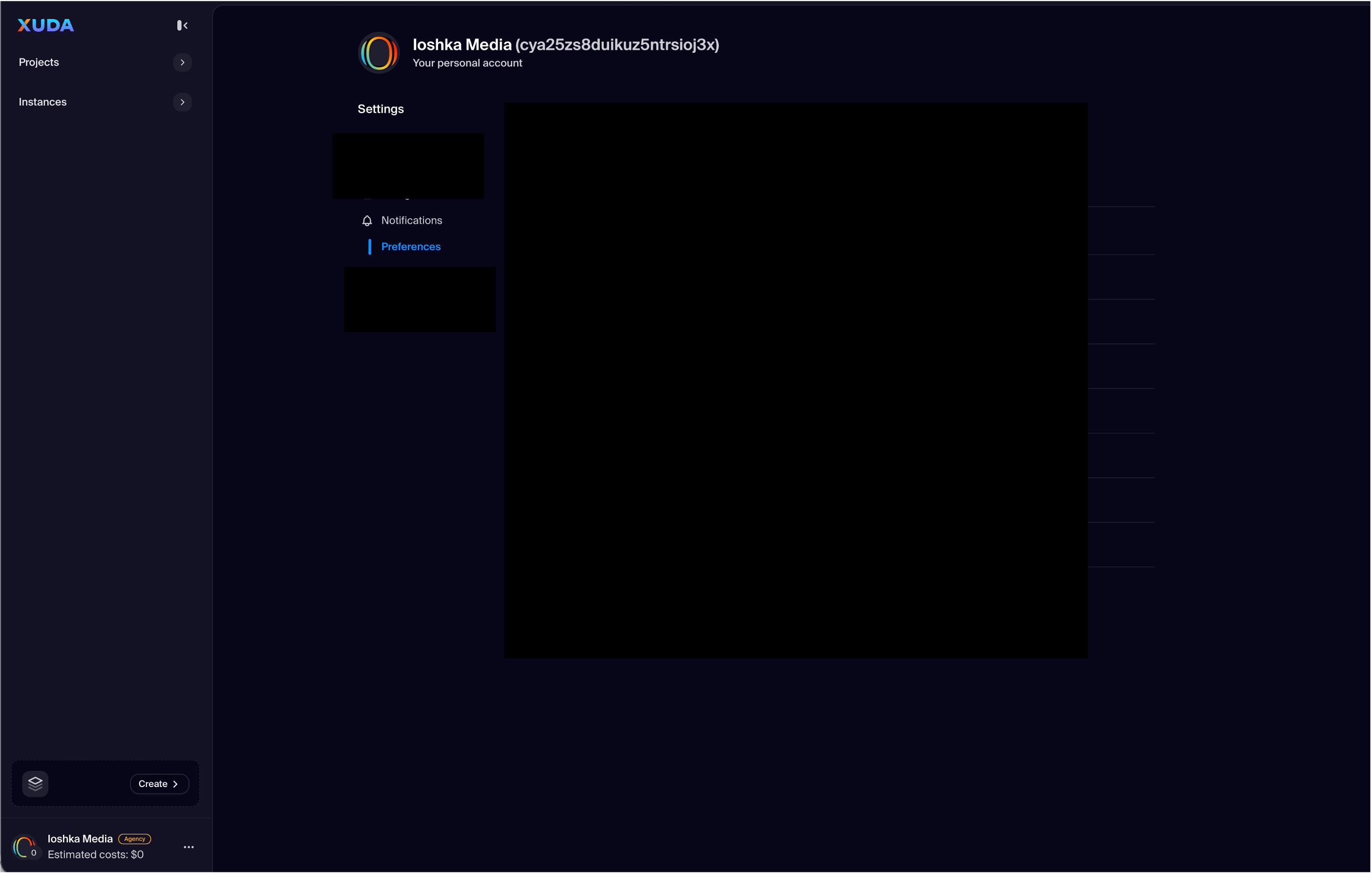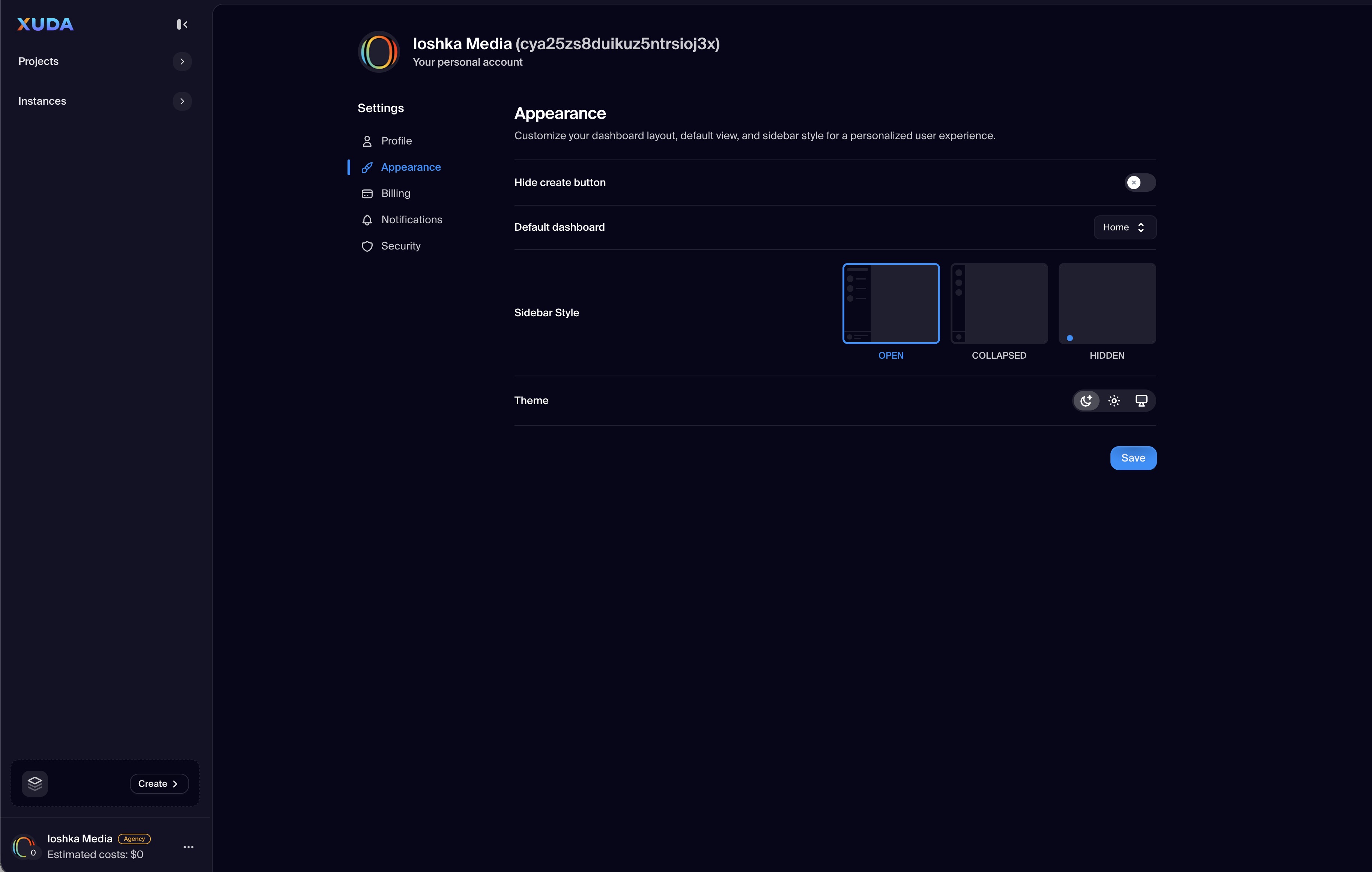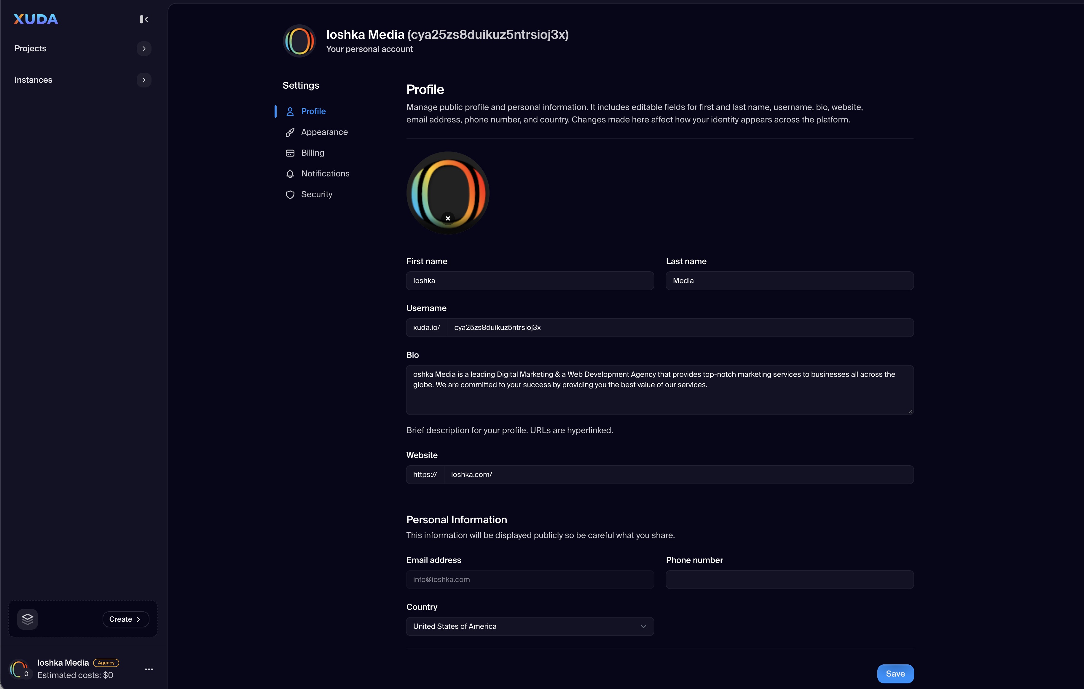 The User Dashboard Settings view allows users to configure and personalize every aspect of their Xuda account. Organized into intuitive sections, it covers profile management, interface preferences, billing details, notification control, and account security—all in one place.