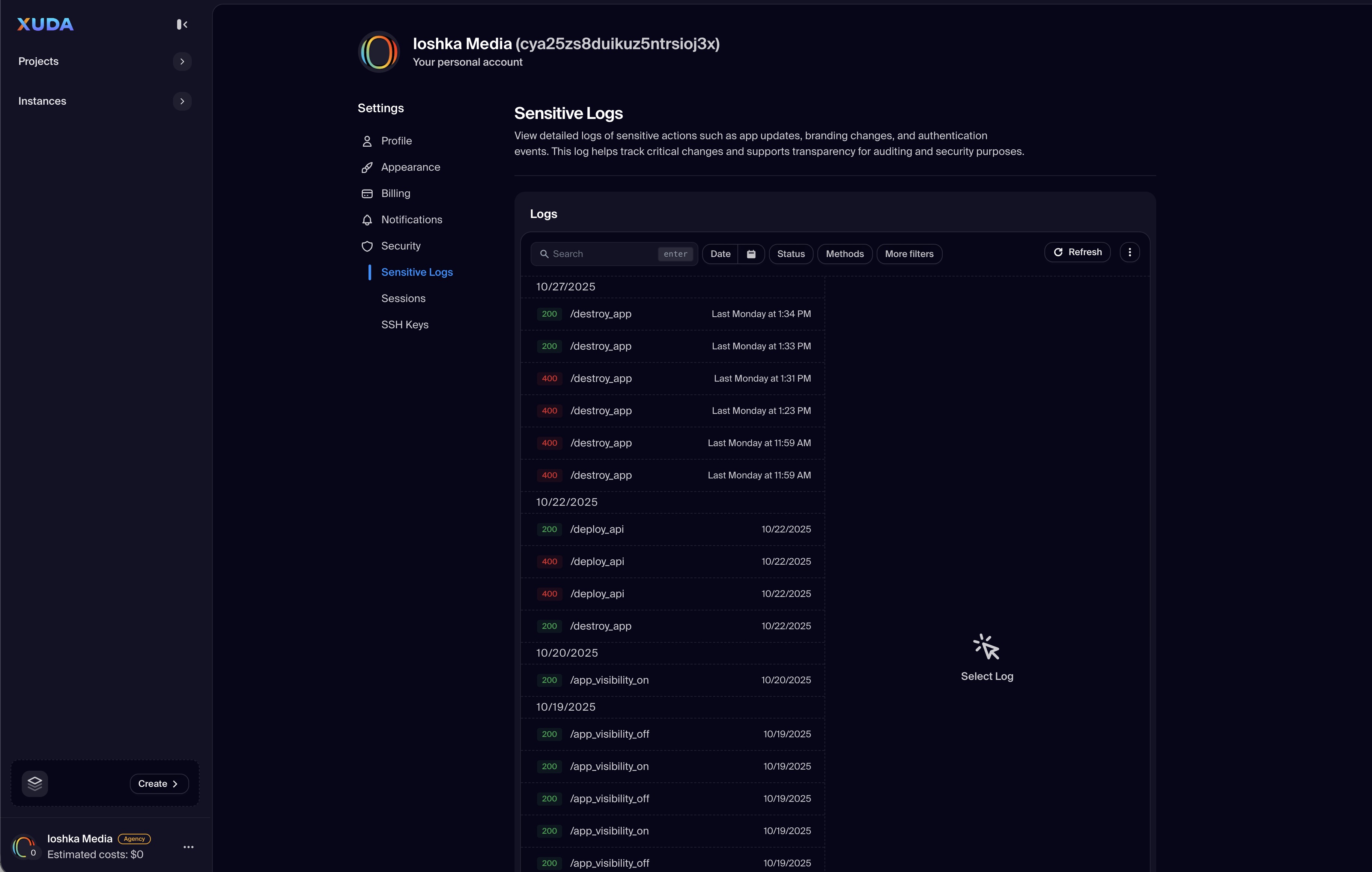 Users can review sign-in locations, terminate unwanted sessions, and rotate SSH keys used for secure deployment access. The Sensitive Logs feature captures account-level security actions—such as password changes, API key usage, and login attempts—ensuring auditability and protection against unauthorized activity.
