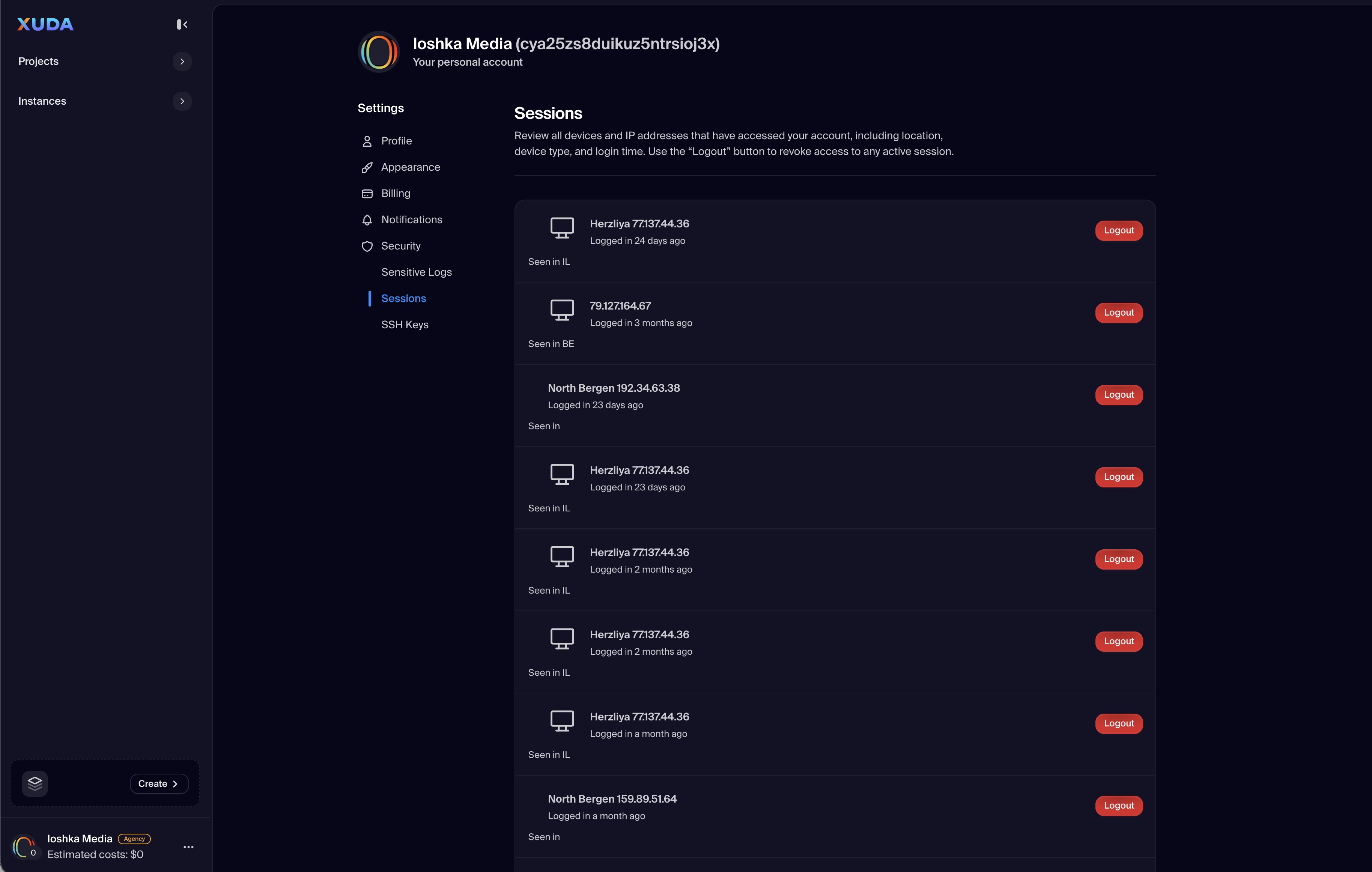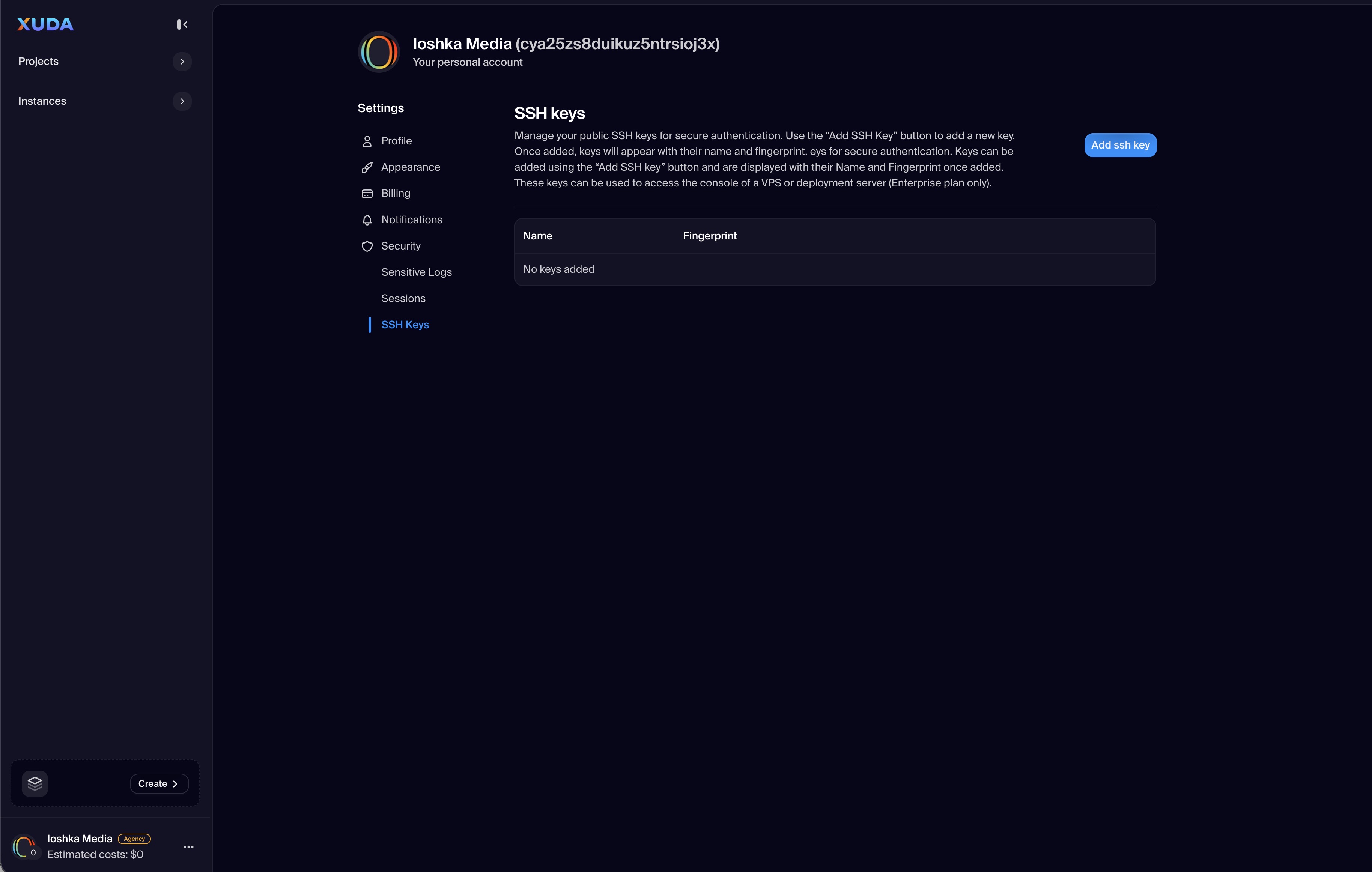 The Security section helps users manage authentication and access integrity for their Xuda account. From this interface, users can view Sensitive Logs, monitor active Sessions, and manage authorized SSH Keys. This centralized approach provides complete transparency and control over login activity and credential management.