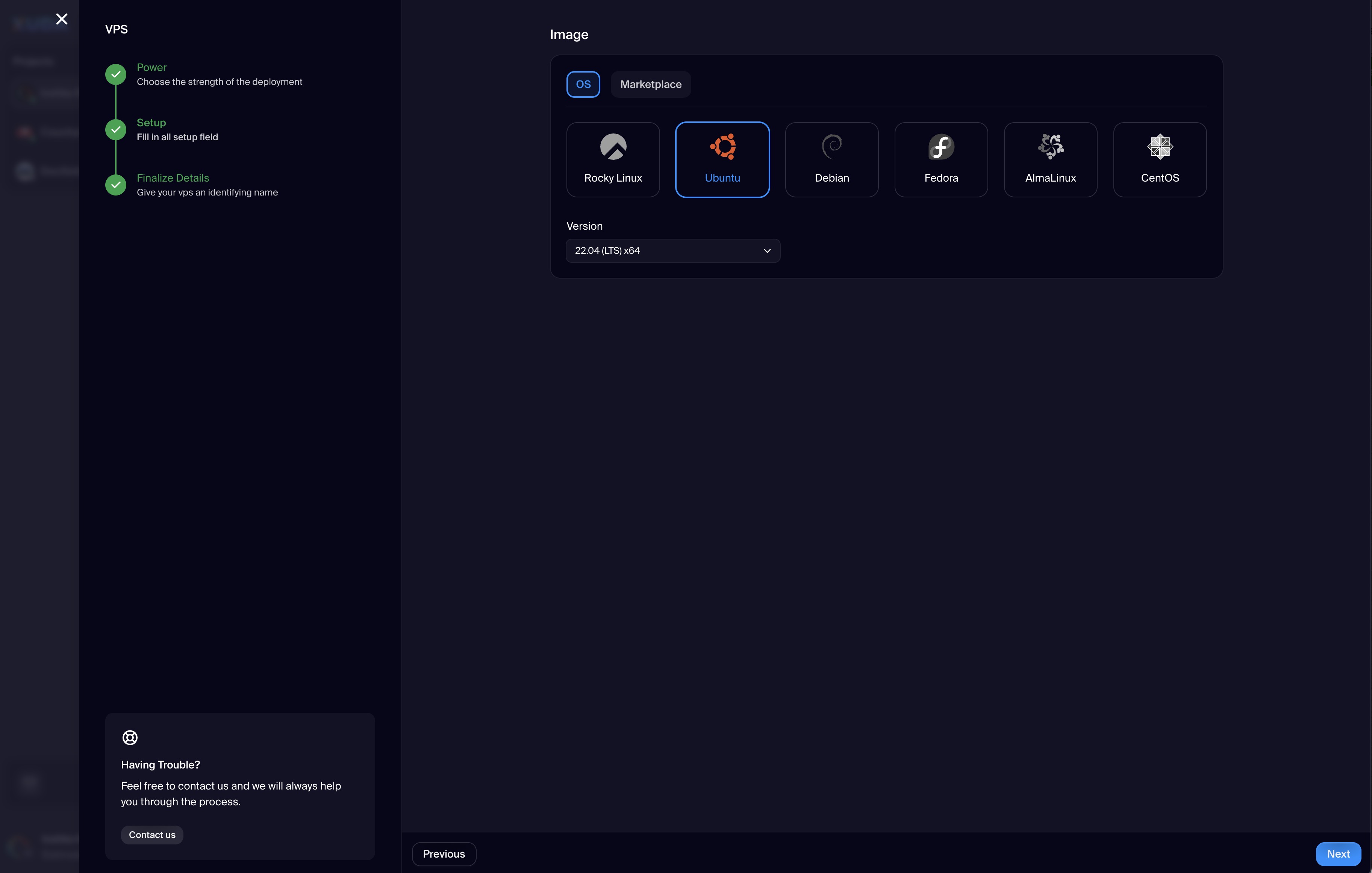 Select from popular Linux distributions (Ubuntu, Rocky, Debian, Fedora, AlmaLinux, CentOS). A version dropdown (e.g., Ubuntu 22.04 LTS x64) ensures deterministic installs and repeatable environments.
